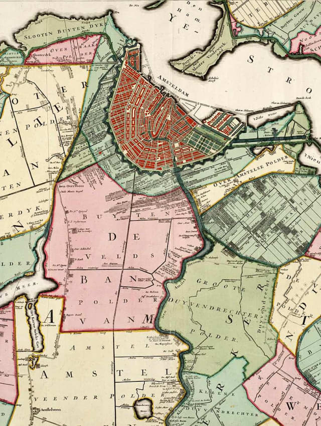 Deze landkaart is gemaakt Reinier en Josua Ottens (Amsterdam, ca. 1750) - 'Wydvermaarde en beroemde koopstad Amsteldam met d'omleggende landen'